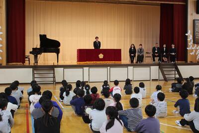 始業式 投稿: 作成者 (04/06) R8年度着任式・前期の始業式を行いました。 代表の児童からご挨拶もありました。 始業式でも2名の代表児童が抱負を発表してくれました。 その後、新しい担任の先生と一緒に教室に戻りました。 どの学年もうれしそうにしていました。 桜も子どもたちを応援するかのようにとてもきれいに咲いていました。 -
